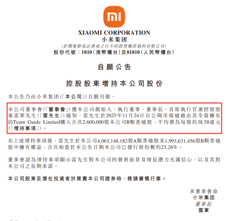 小米集团11月24日晚发布公告,本公司创举东说念主、奉行董事、董事长、首席奉行官兼控股股东雷军于2025年11月24日通过由其全资领有的Team Guide Limited购入合共260万股本公司B类普通股,平均价为每股约38.58港元,雷军持股比例加多至23.26%。这一操作引发了市集的浓烈关切。