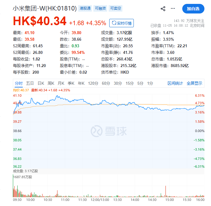雷军这次增持,平直向市集开释了一个浓烈信号:对小米有信心,看好小米的明天。在雷军增持的第二天,小米集团股价25日早盘大涨,强势回升,成效归附40港元关隘。限制收盘,小米股价涨4.35%,报40.34港元/股,最新市值约1.05万亿港元,重回万亿市值行列。