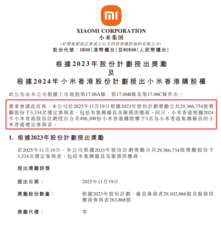 小米集团11月19日晚发布公告称,笔据2023年股份筹办,向3334名继承参与者授出合共29366734股奖励股份,包括集团雇员及管事供应商。按当日港股收盘价每股38.82港元野心,这次授出股份总价值约11.4亿港元。