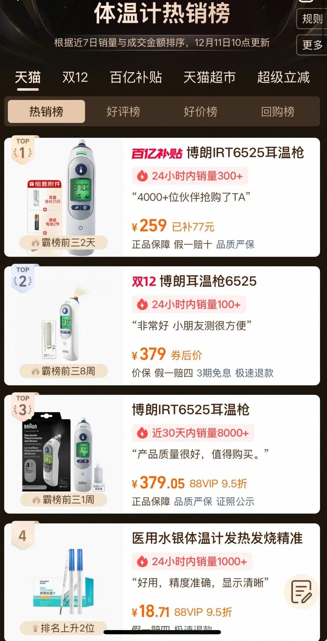 有道理的是,天然酬酢平台上充满了网友对水银体温计的不舍,但在购物平台的“体温计热销榜”上,价钱更高但使用更或者的耳温枪占据着榜单的前三位;在“好评榜”上,位列榜首的亦然一款耳温枪婴儿体温计,并非被称为“童年悼念”的水银体温计。